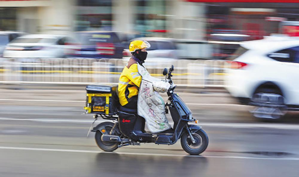 5月1日,山东省滕州市,一名外卖员在送餐。 李志军 摄(新华社发)