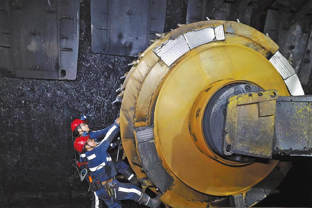 5月1日,国家能源集团神东煤炭哈拉沟煤矿综采一队在更换采煤机截齿。郝文婷 摄(人民视觉)