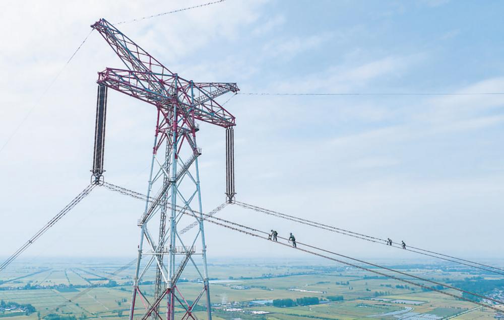 五月一日,安徽省安庆市望江县,工人在两百多米的高空检修特高压跨江线路。 郑贤列 摄 (人民视觉)