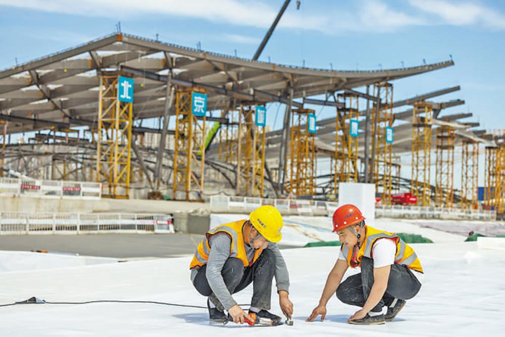 “五一”假期,北京城市副中心站综合交通枢纽施工现场,工人在铺设防水卷材。人民日报记者 张武军 摄