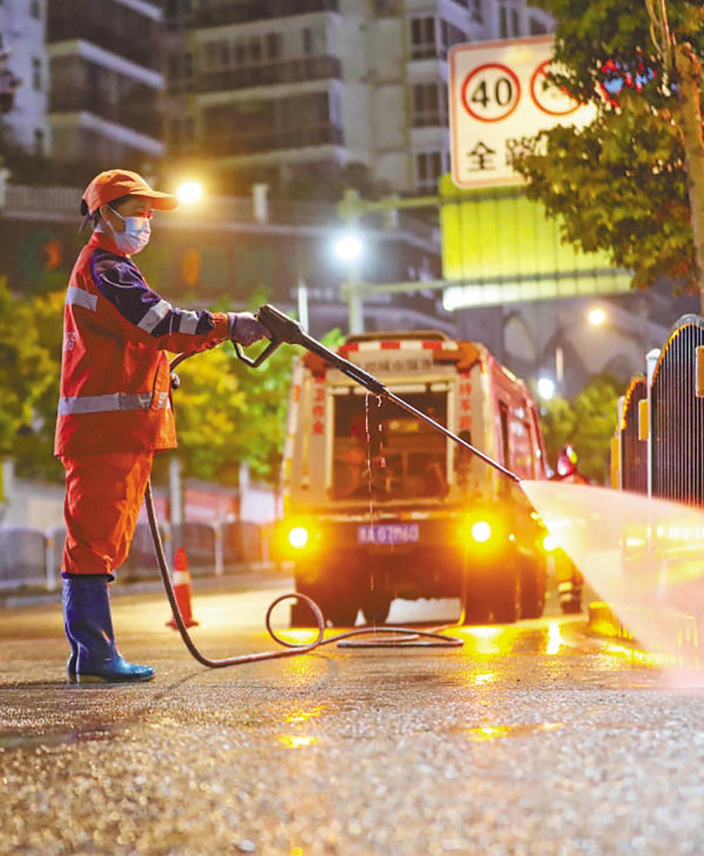 5月1日,贵州省贵阳市开阳县开州大道,环卫工人在清洗护栏。 袁福洪 摄(影像中国)