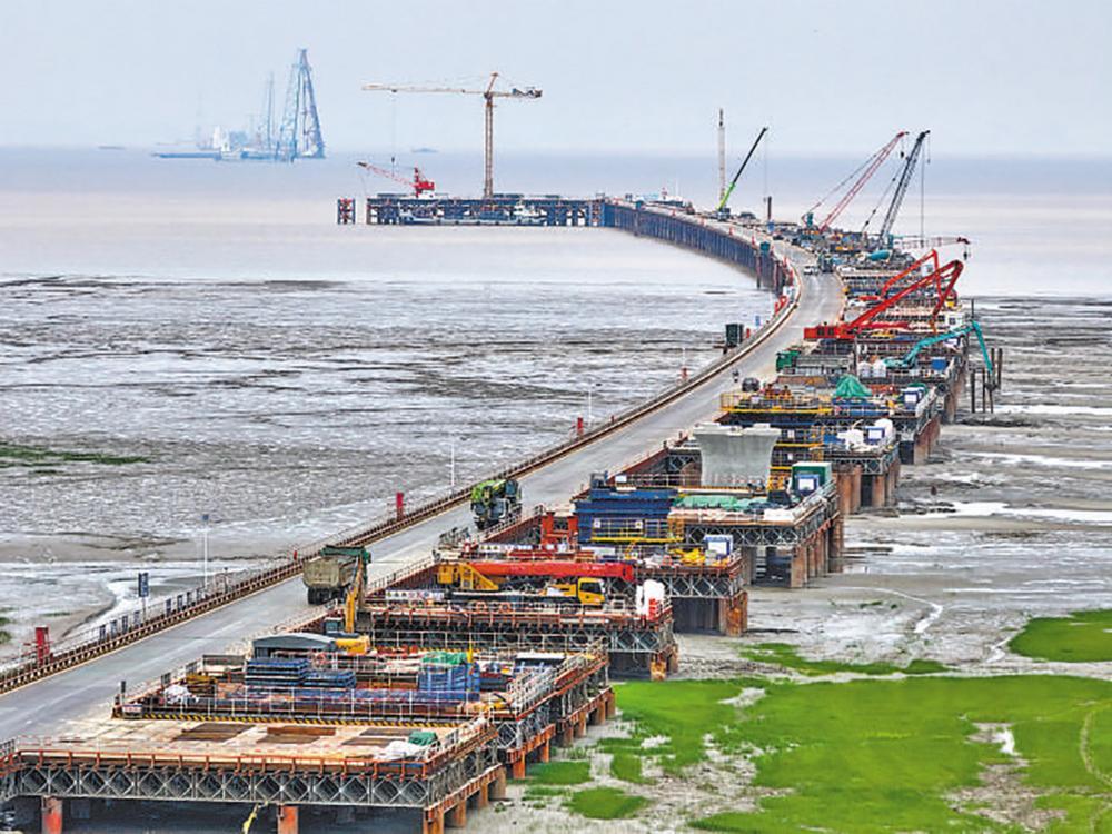 5月2日,杭州湾跨海铁路大桥正加紧施工。樊颖杰 摄(影像中国)