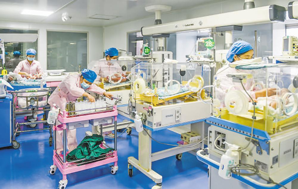 “五一”假期,湖南省永州市道县人民医院新生儿科,护士在照护新生儿。 蒋克青 摄(人民视觉)