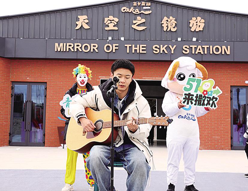 以“天空之镜”为幕布,用高山草原组混响。一支话筒的矗立就是一个舞台,成就无数游客的歌唱梦想。为不断丰富游客体验,茶卡盐湖景区全新设置“全民K歌”区域,让游客沉浸式打卡盐湖风光。