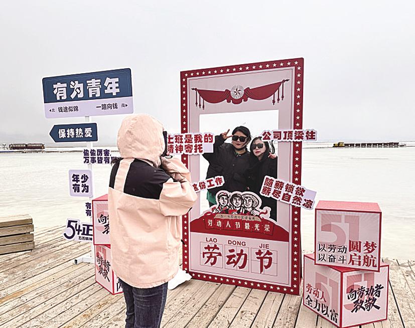 “热爱生活”“有为青年”“向劳动者致敬”……游客穿行在景区里,在一个个充满生活气息的标语下打卡拍照。茶卡盐湖景区每年都会更换沉浸式打卡装置,今年更是增设27处以盐湖历史、民俗文化、盐雕体验为主题的暮雪礼堂、热气球、水中秋千、爱心平台、鲸落、爱心坐凳等拍摄道具,为游客提供更加丰富的拍摄体验。