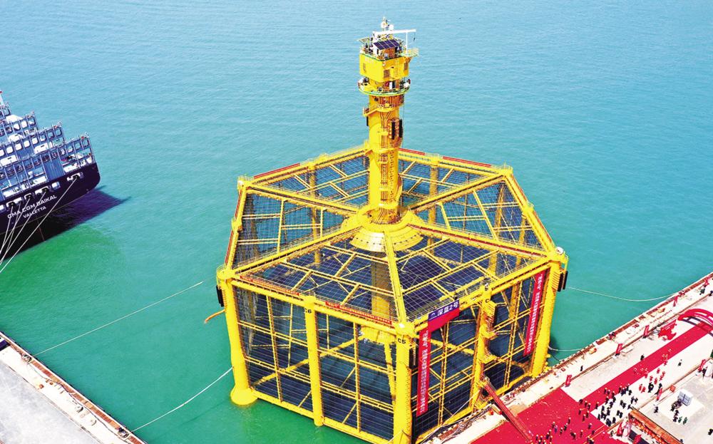 “深蓝2号”大型智能 深海养殖网箱陆地完工 5月9日,在山东青岛拍摄的“深蓝2号”大型智能深海养殖网箱(无人机照片)。 当日,山东青岛造船厂建造的“深蓝2号”大型智能深海养殖网箱实现陆地完工。据介绍,该网箱总高度71.5米,直径70米,全潜状态设计养殖水体达9万立方米,是目前我国应用海域最远、适用水深最深、养殖水体最大、功能性能最先进的深远海养殖网箱装备。该养殖网箱通过搭载自动投喂系统、水文水质气象测量系统、水下成像系统、水下补光系统及生物量监测系统等智慧化养殖设备,可实现陆海联动,搭建一体化数字化管理模式,逐步实现深远海无人养殖功能。 新华社发(梁孝鹏 摄)