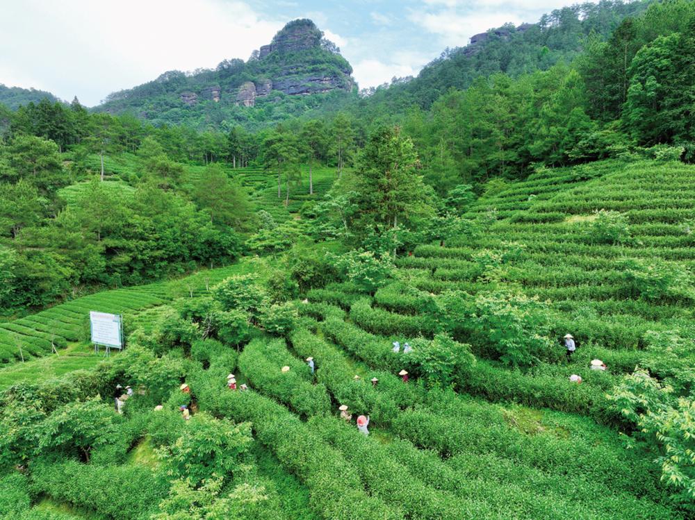 近日,在武夷山市星村镇燕子窠生态茶园内,工人在手工采茶(无人机照片)。 福建是我国产茶大省,所产的茶叶种类繁多。近年来,福建协同推进茶文化、茶产业、茶科技融合发展,探索“三茶”统筹发展新模式,福鼎白茶、武夷岩茶、安溪铁观音茶等茶产业正加速融入文旅、大健康、餐饮等赛道,催生新茶饮、茶美食、茶庄园等新产品、新业态。片片茶叶惠及万千茶农,茶产业成为福建乡村振兴、助农增收的支柱产业。 新华社记者 姜克红 摄