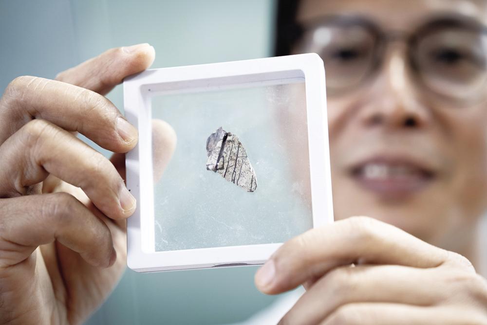 5月14日,研究人员展示经过清理修复的暴龙超科牙齿化石。我国科研团队近日在国际学术期刊《白垩纪研究》发表一项研究成果,将此前在广东省三水盆地发现的一批晚白垩世的大型兽脚类恐龙牙齿归入暴龙超科。研究人员称,这是三水盆地大型兽脚类的首次发现,也是截至目前我国发现的地理位置最南端的暴龙超科化石。新华社发(魏梦佳 摄)
