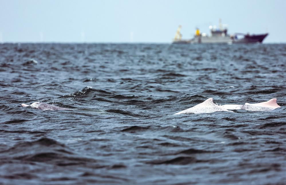 ? 5月16日,中华白海豚在广东湛江雷州湾海域畅游。中华白海豚是国家一级保护野生动物,被誉为“海上大熊猫”,对海洋水质环境十分敏感,被视为衡量海洋生态环境的活指标。新华社发(兰红光 摄)