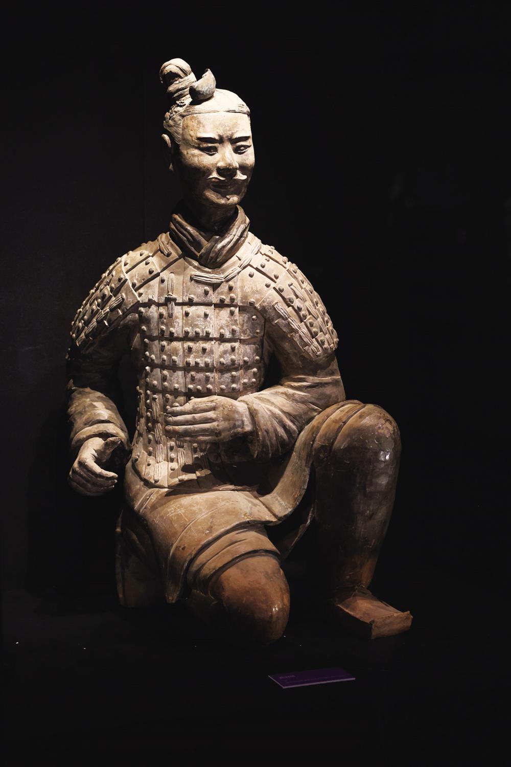 这是在陕西历史博物馆秦汉馆展出的秦跪射俑(4月15日摄)。陕西历史博物馆秦汉馆“秦汉文明”系列展览展出包括汉代古船“丝路一号”、杜虎符、鎏金铜蚕在内的约1500件文物。新华社记者 李一博 摄