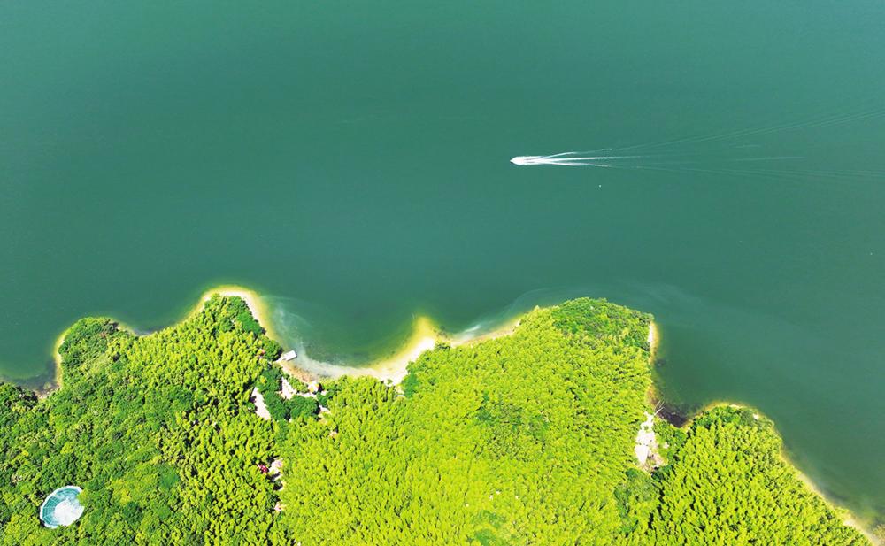5月14日,游船在江苏省溧阳市天目湖景区内行驶(无人机照片)。新华社发(孟德龙 摄)