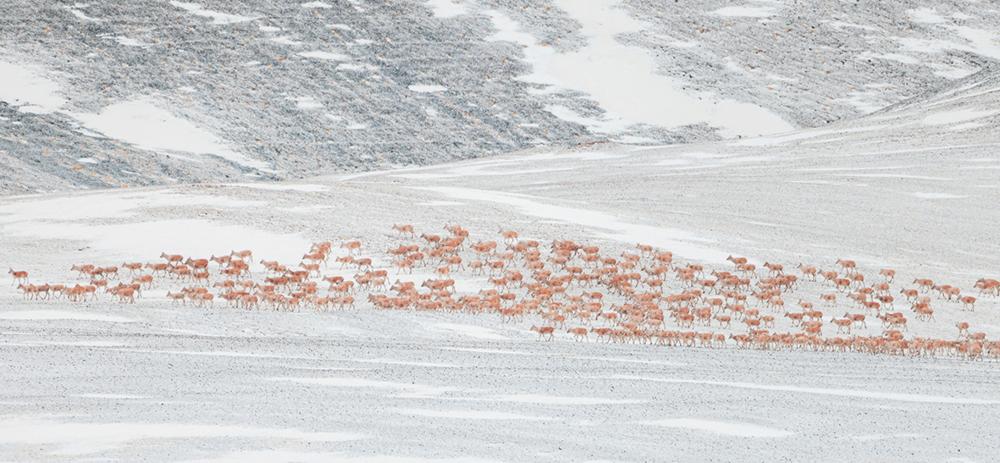▲ 藏羚羊向产羔地迁徙(5月10日摄)。近日,在位于西藏自治区北部的羌塘国家级自然保护区,大群怀孕的雌性藏羚羊开始集结成群,向习惯产羔地迁徙。新华社记者 丁增尼达 摄