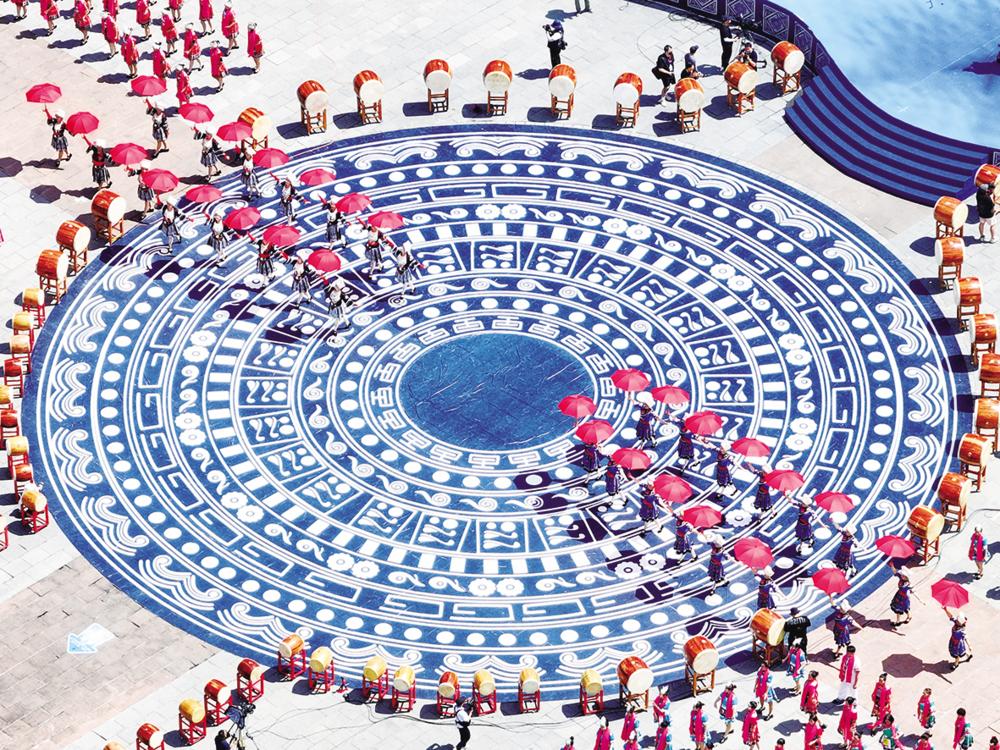 5月15日,第十三届中国乌江苗族踩花山节在重庆市彭水苗族土家族自治县的蚩尤九黎城正式启幕。这是苗族同胞在踩花山节上载歌载舞(无人机照片)。 新华社记者 唐奕 摄