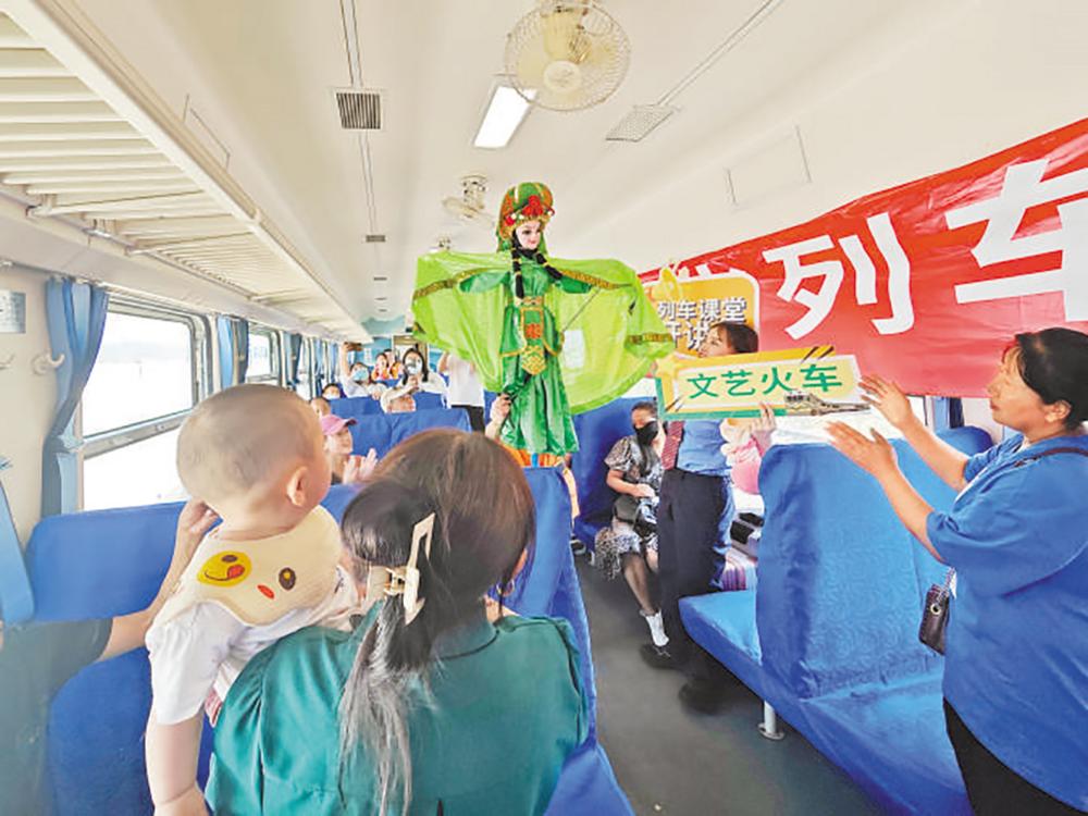非遗 车厢 在四川省攀枝花市开往凉山彝族自治州越西县普雄的5634次慢火车上,车厢中开展非物质文化遗产普及活动。 周俊仰 摄(人民视觉)