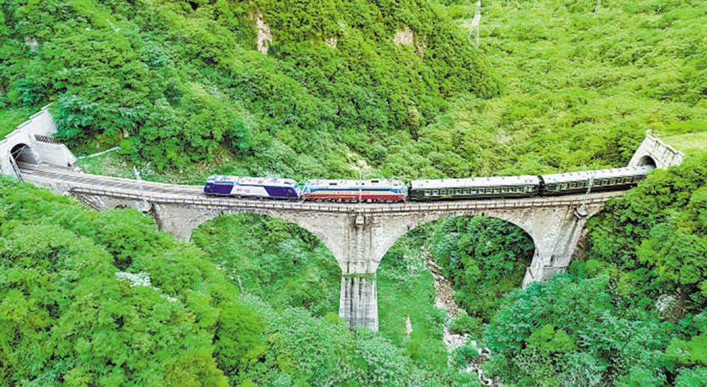 穿林海 从四川省广元市开往陕西省宝鸡市的6064次慢火车,行驶在宝成铁路松树坡铁路桥上,旁边是郁郁葱葱的林海。 刘一江 摄(人民视觉)
