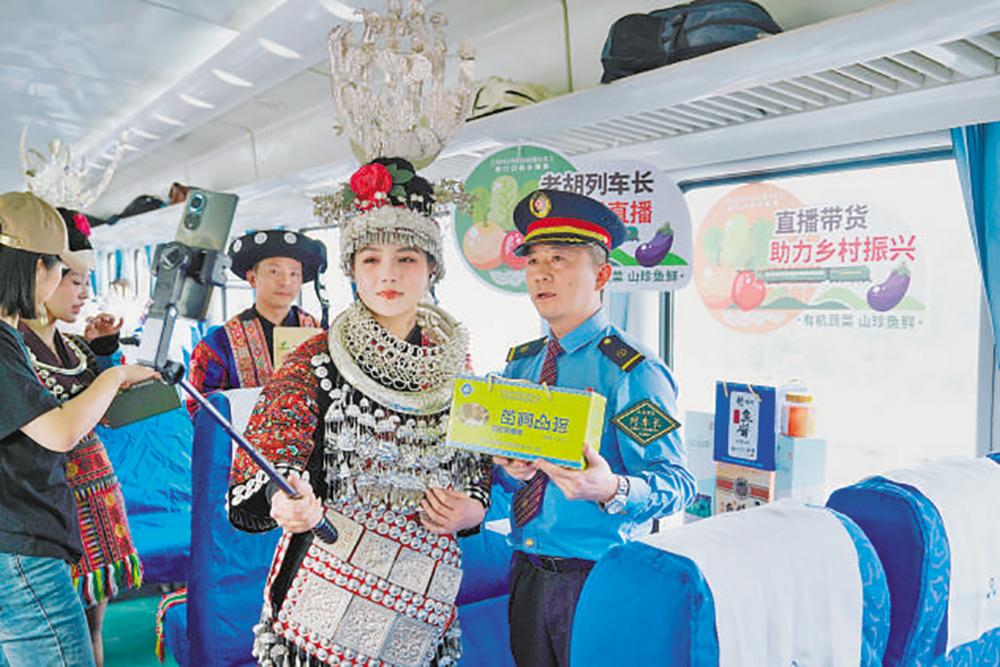 带货 车厢 从贵州省玉屏侗族自治县开往贵阳市的5639次慢火车列车长胡贵川(右一),尝试用网络直播的方式帮助老乡们带货。 沈向全 摄(人民视觉)