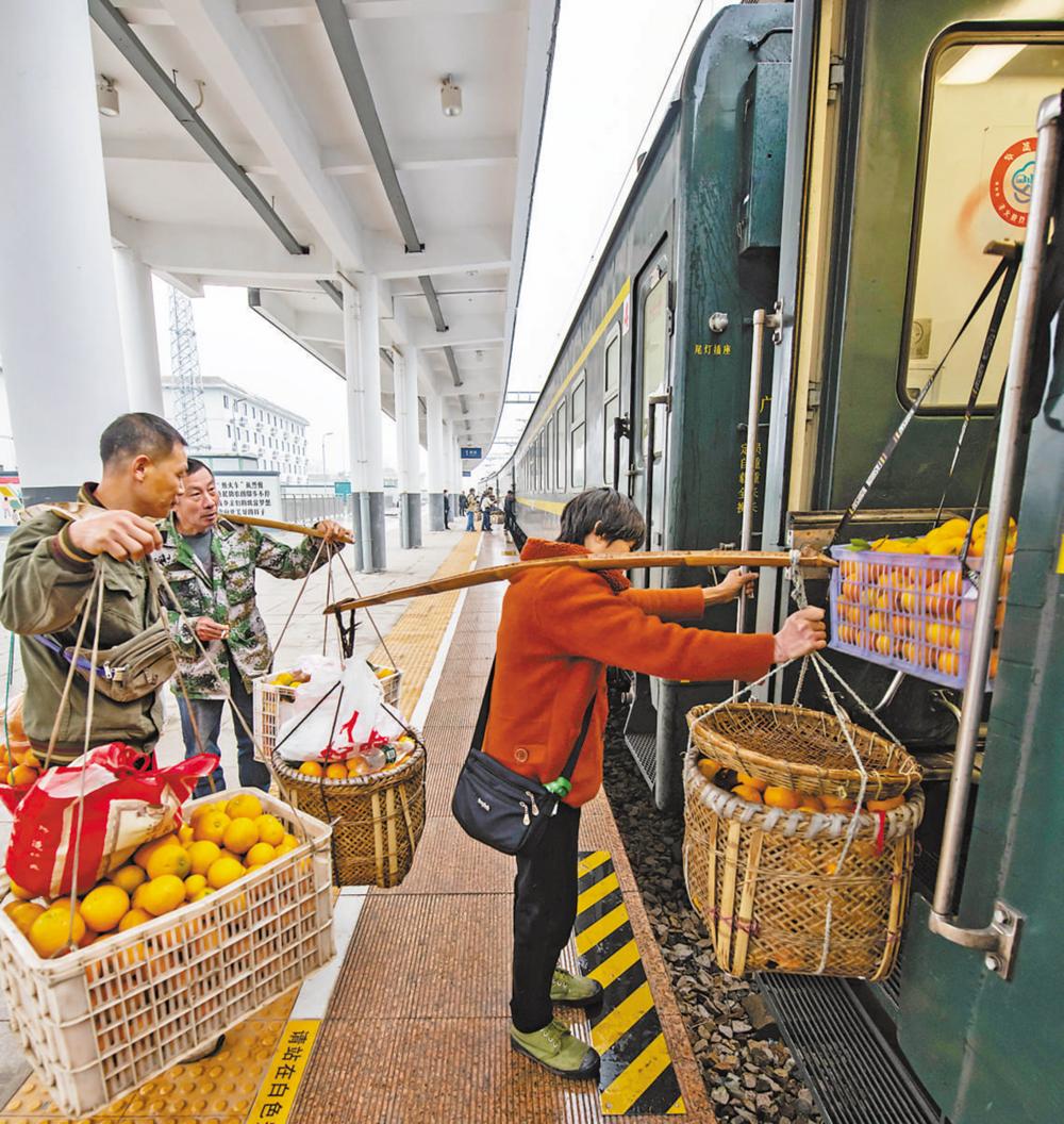 从湖南省怀化市开往重庆市秀山土家族苗族自治县梅江的7272次慢火车停靠在湖南省麻阳苗族自治县锦和站,村民挑着当地特产冰糖柑登上列车,运往贵州省铜仁市销售。 田文国 摄(影像中国)