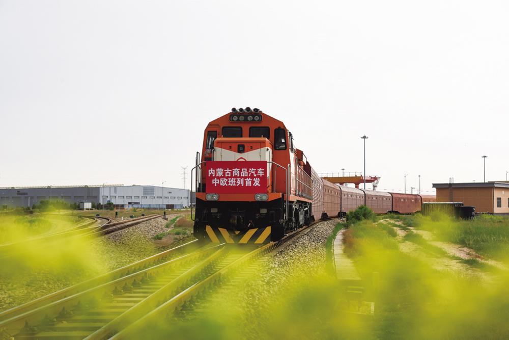6月12日在内蒙古呼和浩特市沙良物流园拍摄的呼和浩特首趟中欧班列商品汽车运输专列。 当日,在位于内蒙古呼和浩特市的中国铁路呼和浩特局集团有限公司沙良物流园,一列满载29个集装箱、290辆国产商品汽车的中欧班列驶出。本趟班列为呼和浩特首趟中欧班列商品汽车运输专列,所搭载的汽车均为内蒙古当地生产,将经新疆阿拉山口口岸,最终运抵俄罗斯莫斯科。新华社记者 贝赫 摄