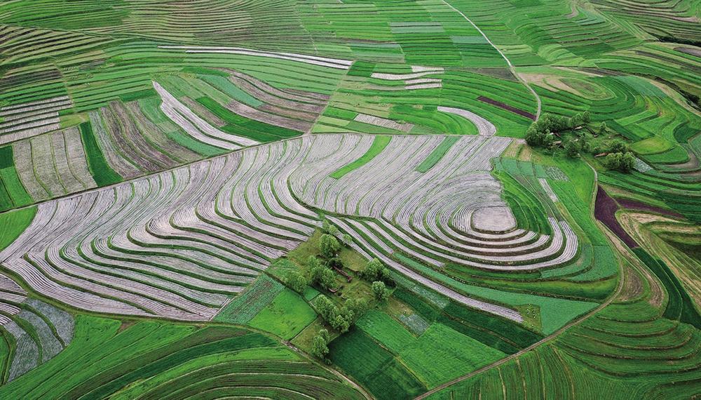 海东市互助土族自治县乡村梯田如仙子舞动柔美飘带,勾勒出灵动美景,映射出新农村的勃勃生机。