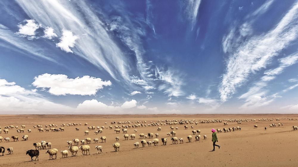 金色阳光洒在美丽的金银滩草原,牧羊人挥舞着长鞭,羊群在蓝天白云下悠然觅食。