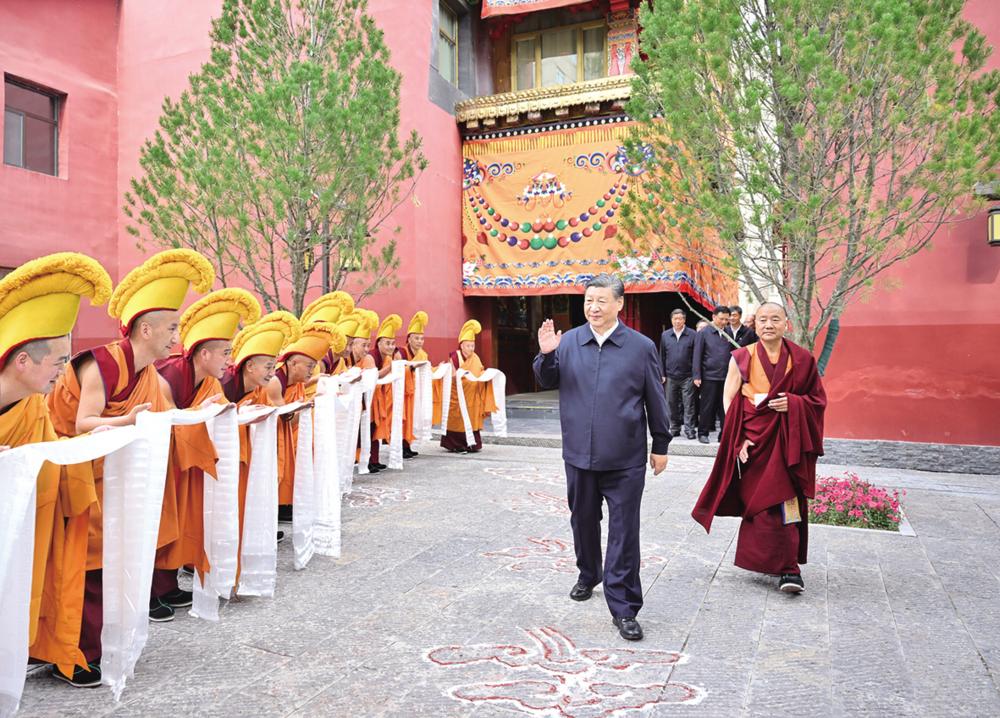 随后,习近平来到位于西宁市城中区的宏觉寺。在寺前院落,宏觉寺民主管理委员会负责人向总书记敬献哈达,僧人提香炉、持宝伞迎接总书记。 习近平参观青海省民族团结进步教育基地展陈等,了解寺庙历史沿革、老一辈革命家关心推动民族工作和宗教工作的情况。他走进大殿,听取寺庙加强日常管理、促进民族团结进步等情况介绍。习近平指出,宏觉寺这座千年古刹,在增进历代中央政府与藏传佛教联系方面发挥了重要的桥梁纽带作用。要保护好这份珍贵的历史文化遗产,为铸牢中华民族共同体意识、促进民族团结进步作出新贡献。要向老一辈革命家学习,把新时代党的统战工作、民族工作、宗教工作做得更好。习近平强调,以中国式现代化全面推进强国建设、民族复兴伟业,需要全国各族人民包括广大信教群众团结奋斗。希望青海藏传佛教界弘扬爱国爱教优良传统,促进宗教和顺、社会和谐、民族和睦,在中国式现代化进程中发挥积极作用。