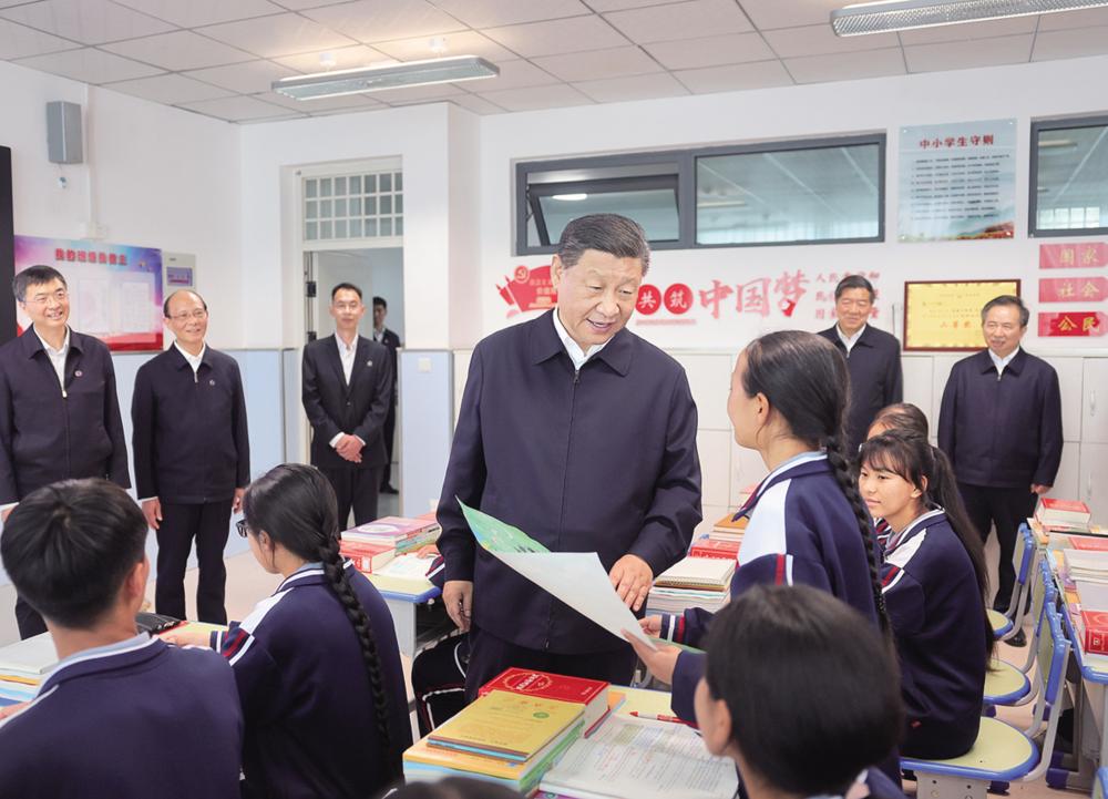 18日下午,习近平首先来到果洛西宁民族中学考察。这是一所隶属于果洛藏族自治州的寄宿制中学,由上海市投资援建。习近平听取上海等东部地区援助青海教育工作和学校建设情况介绍,详细询问学生构成、课程设置、体育锻炼、普通话水平等情况,走进食堂、宿舍楼察看学生就餐和住宿条件,嘱咐食堂工作人员一定要确保学生饮食安全、营养可口。之后,他来到高一(1)班教室,观摩“新时代、新家乡”主题思政课。了解到学校将思政课内容融入日常教学,听了孩子们讲述新时代家乡的可喜变化,看了孩子们的画作,习近平十分高兴。他说,包括教育在内的东西部协作和对口支援取得显著成效,充分彰显了中国共产党领导和中国特色社会主义制度的优势,充分体现了中华民族大家庭的温暖。要把铸牢中华民族共同体意识作为学校思政课的一个重点,讲好中国共产党和中国特色社会主义的故事,讲好新时代以中国式现代化全面推进强国建设、民族复兴伟业的故事,讲好中华民族共同体和民族团结进步的故事,把中华民族共同体意识从小就植入孩子们的心灵。