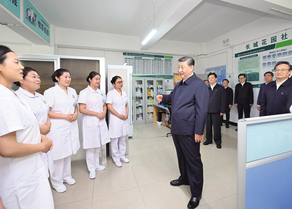6月19日至20日,中共中央总书记、国家主席、中央军委主席习近平在宁夏考察。这是19日下午,习近平在银川市金凤区长城花园社区党群服务中心社区卫生站同医务人员亲切交流。新华社记者 谢环驰 摄