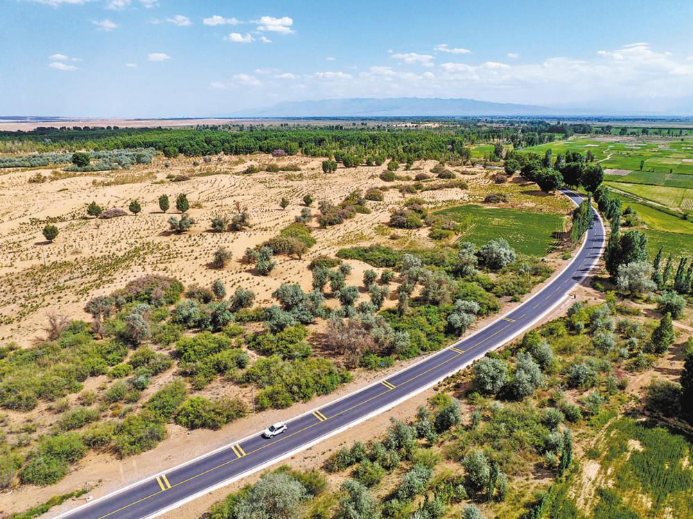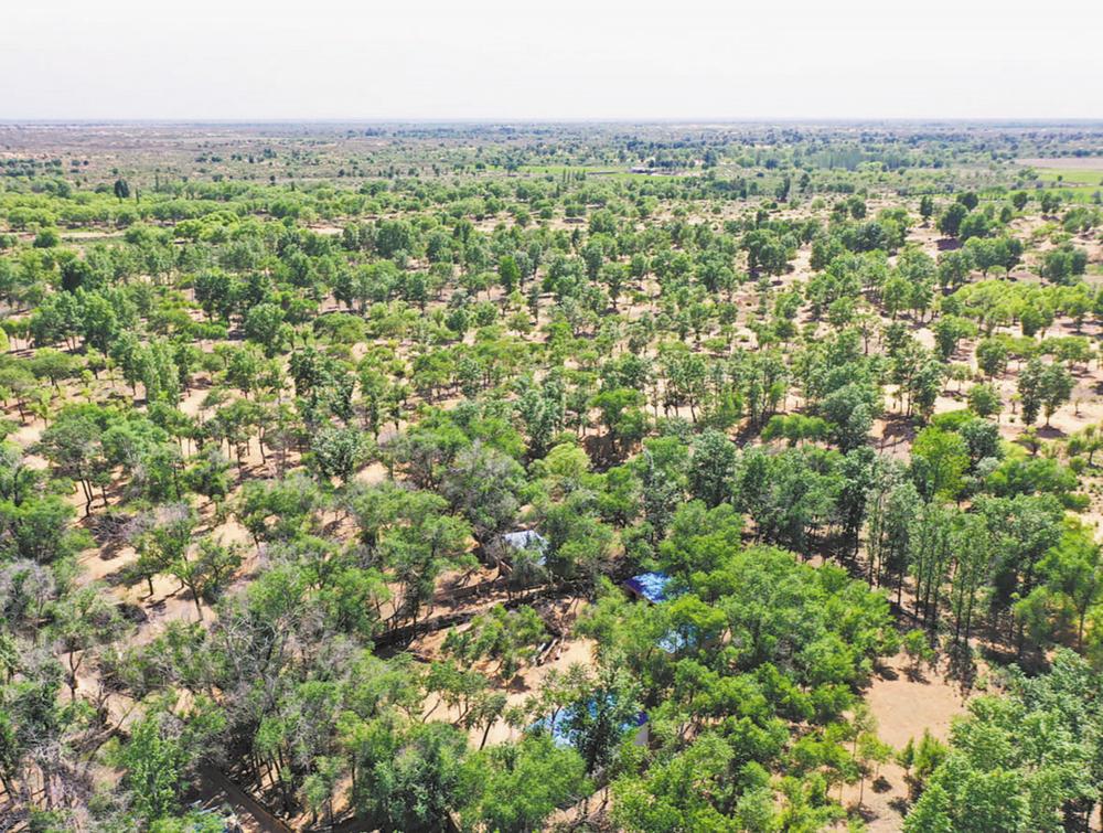 甘肃张掖市高台县北部沙漠种植的梭梭、白杨等锁沙植物。 杨 潇 摄(影像中国)