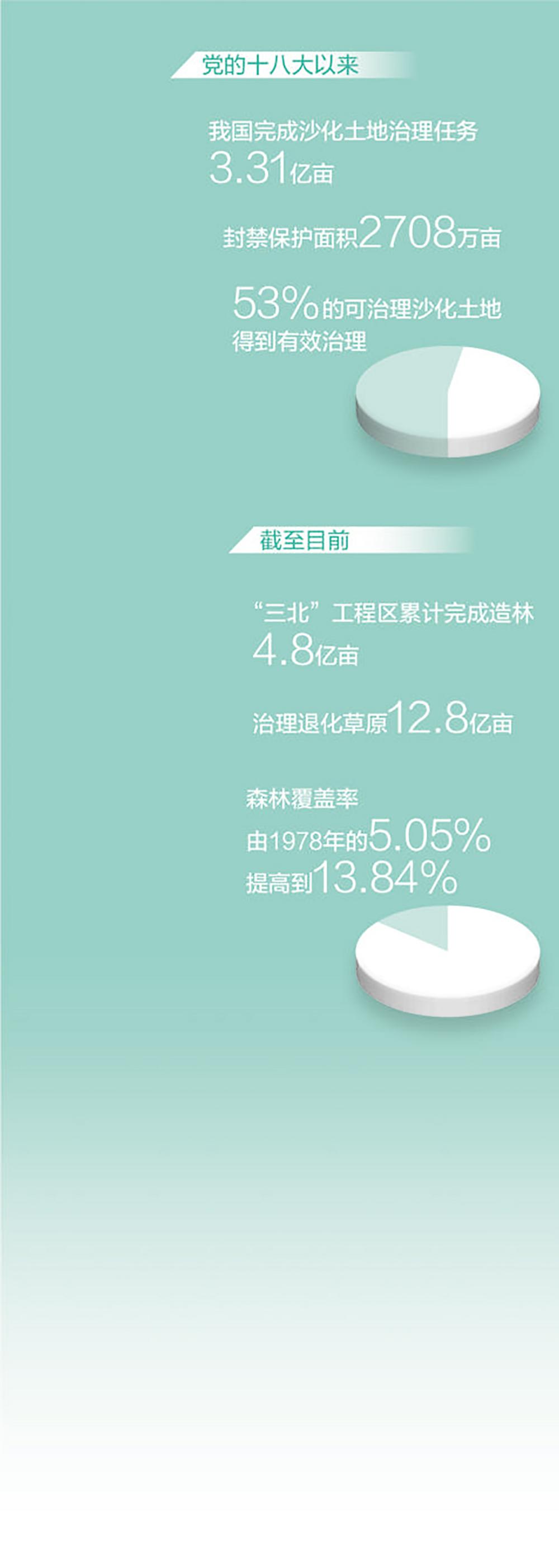 记者从国家林业和草原局获悉:党的十八大以来,我国持续加大“三北”等重点生态工程建设力度,推进科学化、规模化治沙,完成沙化土地治理任务3.31亿亩,封禁保护面积2708万亩,53%的可治理沙化土地得到有效治理。
