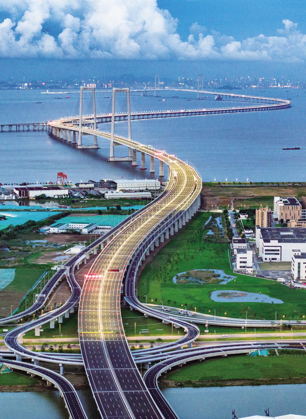 ? 6月27日,华灯初上时的深中通道(无人机照片)。 6月30日,历时七年建设的国家重大工程深中通道正式通车试运营,从深圳到中山的车程从原来的2小时缩短至30分钟。深中通道全长约24公里,集“桥、岛、隧、水下互通”于一体,是世界上综合建设难度最高的跨海集群工程之一。 新华社记者 毛思倩 摄