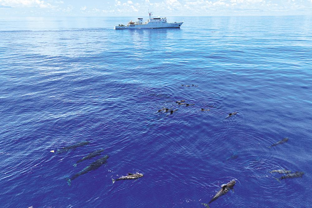 7月6日,一群短肢领航鲸在海南岛东部海域畅游(无人机照片)。 新华社记者 张丽芸 摄