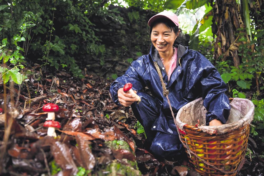 7月2日,云南省大理白族自治州南涧彝族自治县公郎镇村民在采摘大红菌。 新华社发(适志宏摄)