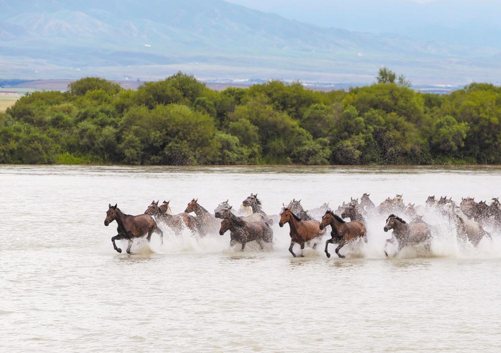 这是7月11日在新疆昭苏湿地公园拍摄的天马浴河。 雪山脚下,草场茵茵,骏马驰骋。昭苏县位于新疆伊犁哈萨克自治州西南部一个群山环抱的高位山间盆地,这里气候湿润、水草丰茂,自古盛产良马,有“天马故乡”的美誉。新华社记者 陈朔 摄