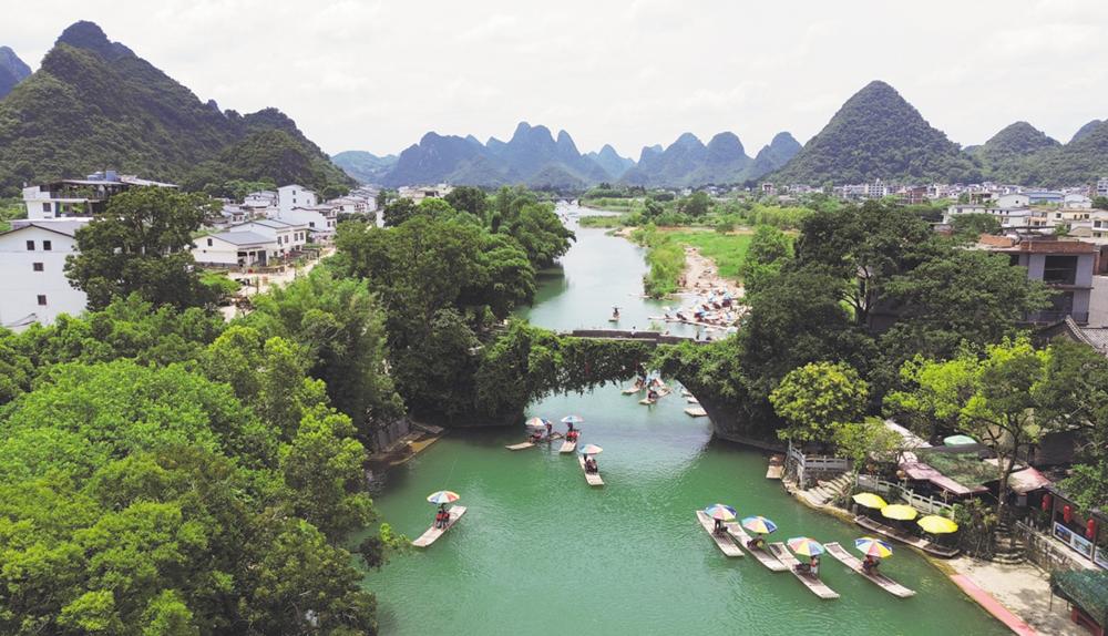 7月14日,游客在广西桂林市阳朔县遇龙河乘坐竹筏漂流观景(无人机照片)。 盛夏时节,多地迎来旅游高峰期,游客纷至沓来,享受休闲度假的美好时光。新华社发(廖祖平 摄)