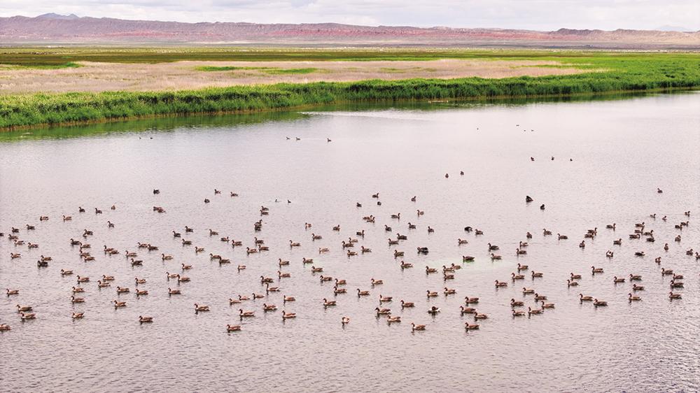 每到候鸟迁徙的季节,乌兰县金子海就会迎来一群特殊的“客人”。斑头雁、黑顶鹤等各种鸟类成群结队地降落,它们在湖边的湿地里觅食、休息,成为了金子海独特的风景。 近年来,乌兰县政府积极行动,加强对周边沙漠化的治理,通过植树种草、设置沙障等方式,有效遏制了沙漠的蔓延,保护了生态边界,金子海的生态保护不仅是对自然环境的修复,更是对人类文明与自然和谐共生的深刻诠释。 本报记者 张萍 摄影报道