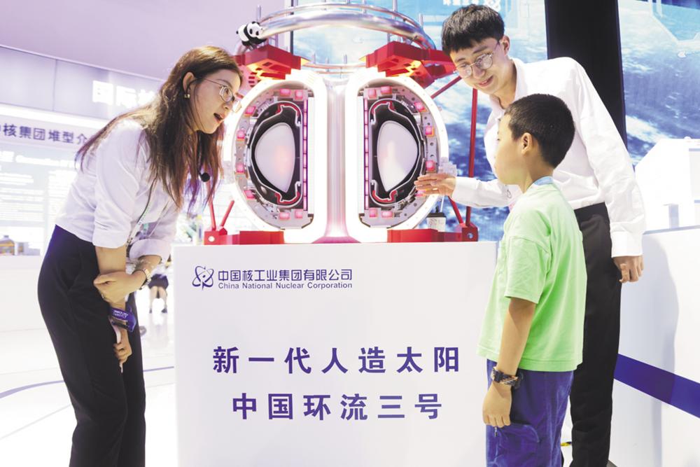 7月14日,中国核工业集团的工作人员在科博会上为一名小观众介绍新一代人造太阳“中国环流三号”。 7月13日至16日,第二十六届中国北京国际科技产业博览会在北京国家会议中心举行。本届科博会共设置信息科技、智能制造、医药健康、绿色双碳、数字经济和区域创新发展等6个专题展区,展示最新科技创新成果和发展趋势。 新华社记者 潘旭 摄