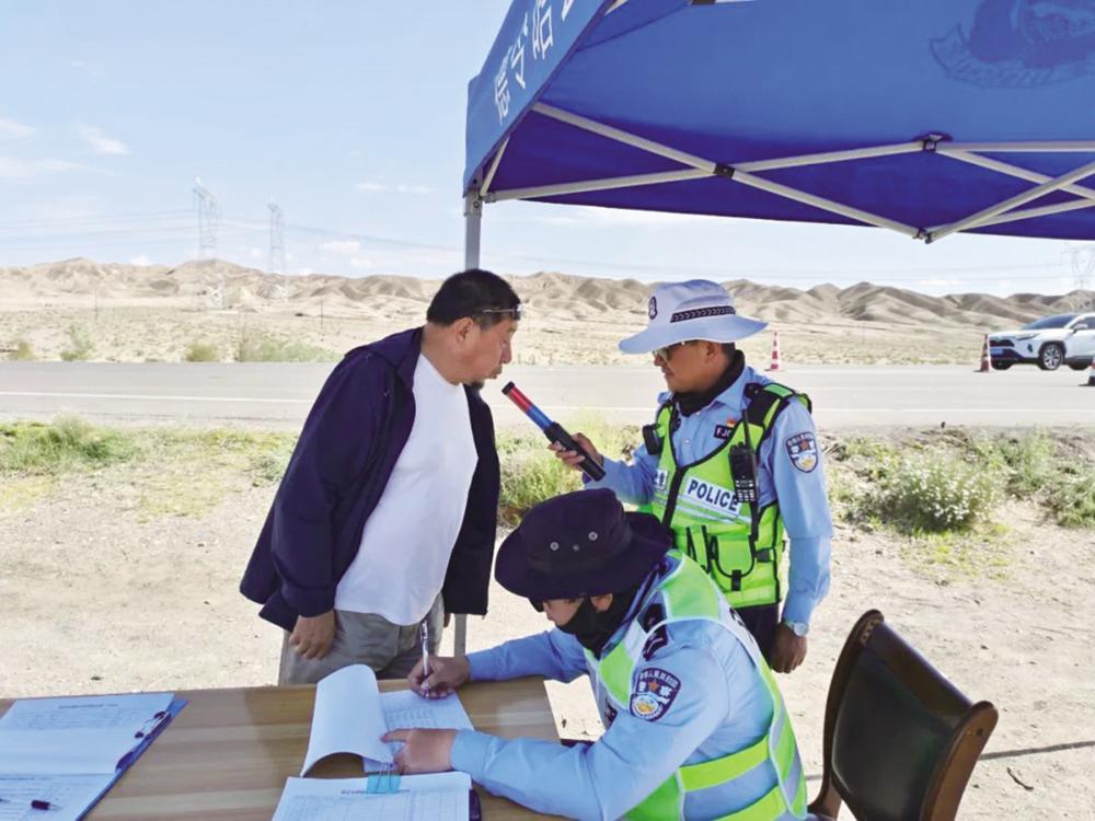 高原烈日炙烤、戈壁风沙洗面,全州各执勤点的民辅警始终保持着高度的严谨、专注、耐心,采取定点检查为主、机动巡逻为辅的方式,重点针对“两客一危一货一面”等重点车辆,严查疲劳驾驶、超员超速、酒驾醉驾等严重交通违法行为,劝导不系安全带、驾车拨打电话等交通陋习,悉心做好安全提示工作,做到全方位管控,严防发生各类交通事故,用民辅警的辛勤付出为广大驾乘人员出行安全保驾护航。