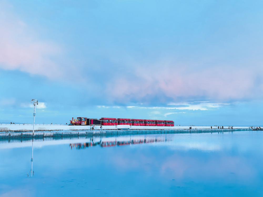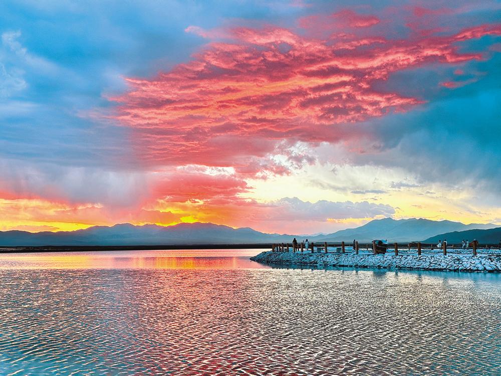 风雨过后,总有惊喜。7月30日,暮色降临时原本晴空万里的茶卡盐湖突下暴雨,降雨持续20分钟后,傍晚的茶卡盐湖迎来绝美晚霞。此次,茶卡盐湖的晚霞还伴随着变幻莫测的光影效果。随着太阳逐渐下沉,光线的角度和强度不断发生变化,晚霞的色彩和形态也随之变幻无穷,同时还出现了粉色的闪电。这种动态的美感,更是让人流连忘返,沉醉其中。