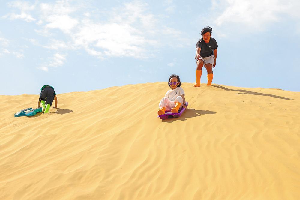 图⑤:小朋友在宁夏回族自治区中卫市沙坡头景区滑沙。新华社记者 吕帅 摄