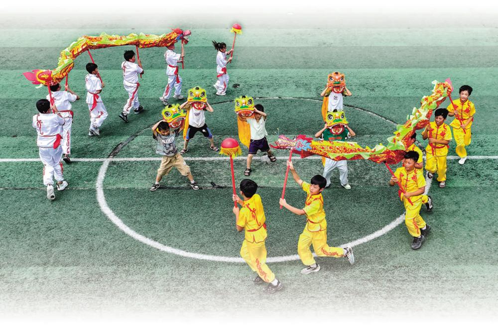 图⑦:安徽省阜阳市阜南县黄岗镇杨寨小学,小朋友们进行舞龙、舞狮训练。 谢贵明 摄(影像中国)