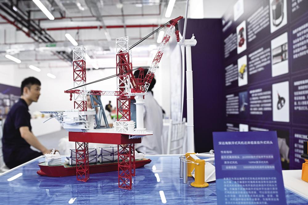 在深海先进技术与装备展览上展出的深远海漂浮式风机近岸组装自升式码头(10月25日摄)。 近日,深海先进技术与装备展览在三亚崖州湾科技城举行。据悉,本次装备展览是首届海南自贸港国际科技创新合作论坛暨深海技术创新大会的配套活动,集中展出深海技术与装备领域的成果。 新华社记者 杨冠宇 摄