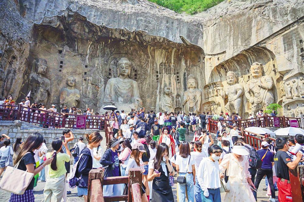 9月16日,游客在河南省洛阳市龙门石窟景区内游览。 当日是中秋假期第二天,人们以丰富多彩的方式度过假日。 新华社发(李卫超 摄)