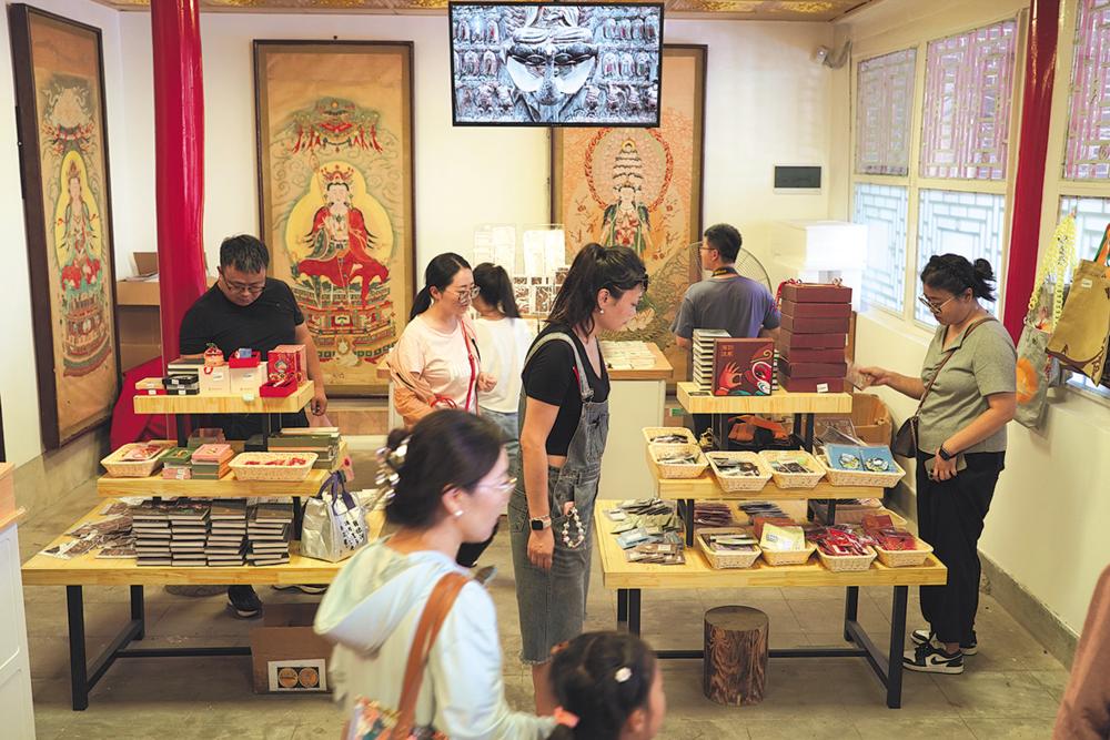 9月16日,游客在陕西西安蓝田县水陆庵内选购文创产品。 当日是中秋假期第二天,人们以丰富多彩的方式度过假日。 新华社记者 邵瑞 摄