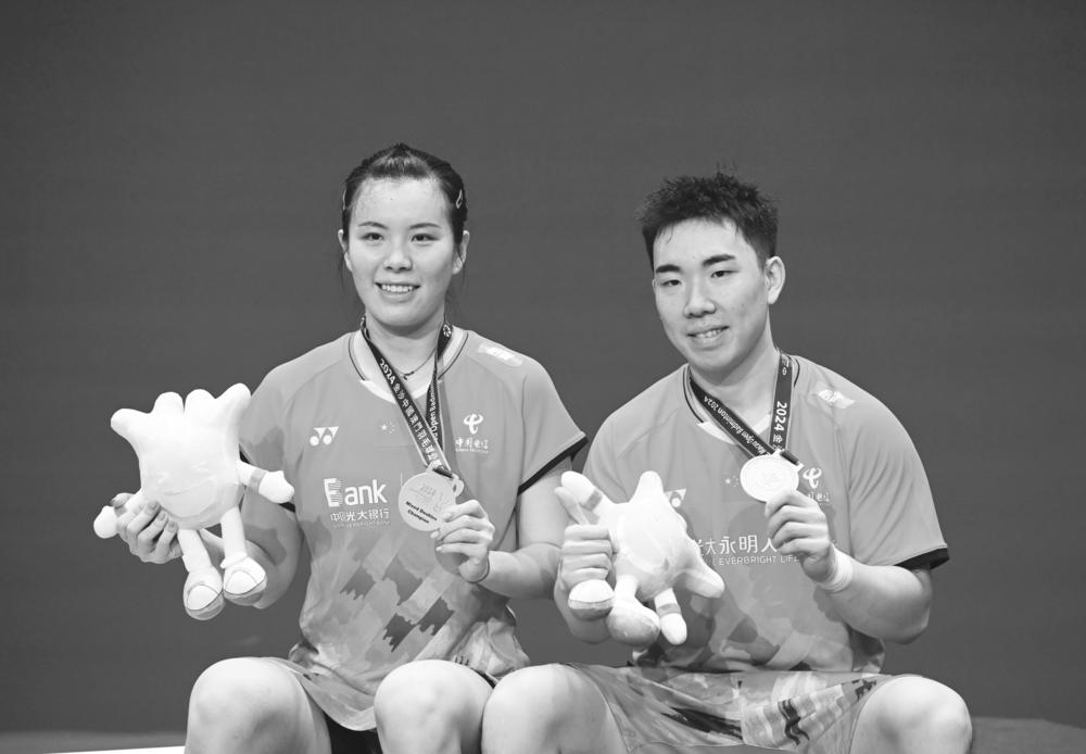 9月29日,郭新娃(右)/陈芳卉在颁奖仪式上。 当日,在2024澳门羽毛球公开赛混双决赛中,中国组合郭新娃/陈芳卉2比0战胜印度尼西亚组合德扬/维德佳佳,获得冠军。新华社记者 张金加 摄