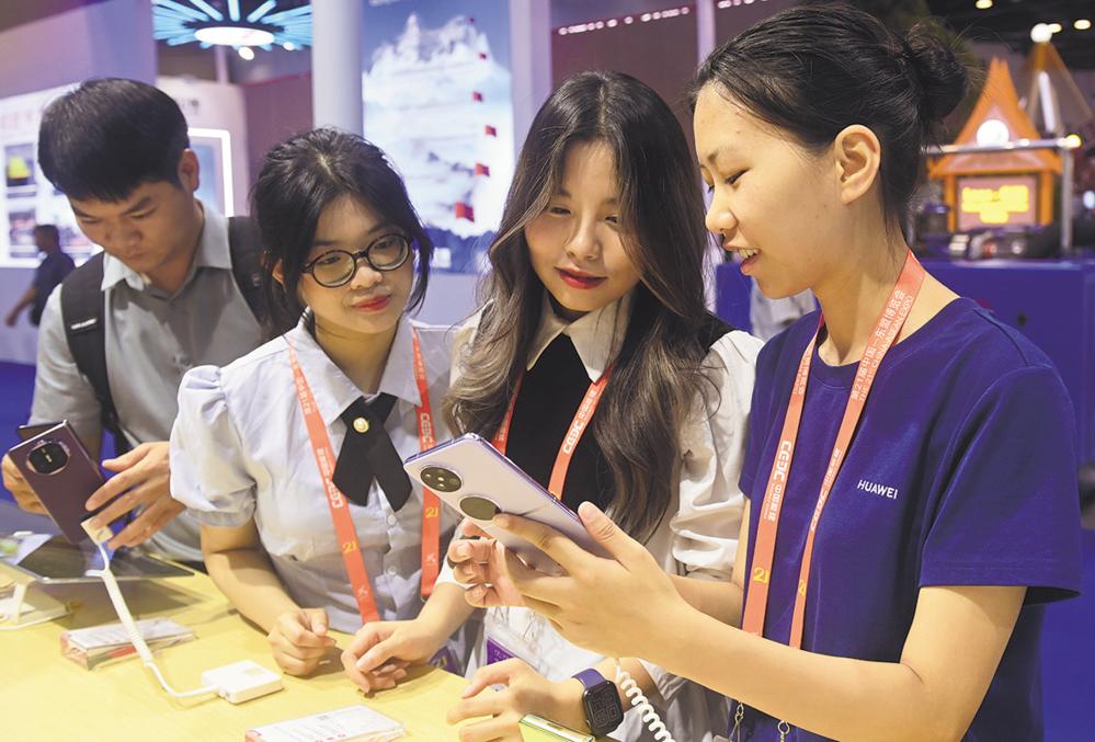 9月28日,在广西南宁国际会展中心,参展人员(右一)向观众推介手机产品。 9月28日,第21届中国—东盟博览会、中国—东盟商务与投资峰会在广西南宁落下帷幕。 新华社记者 陆波岸 摄