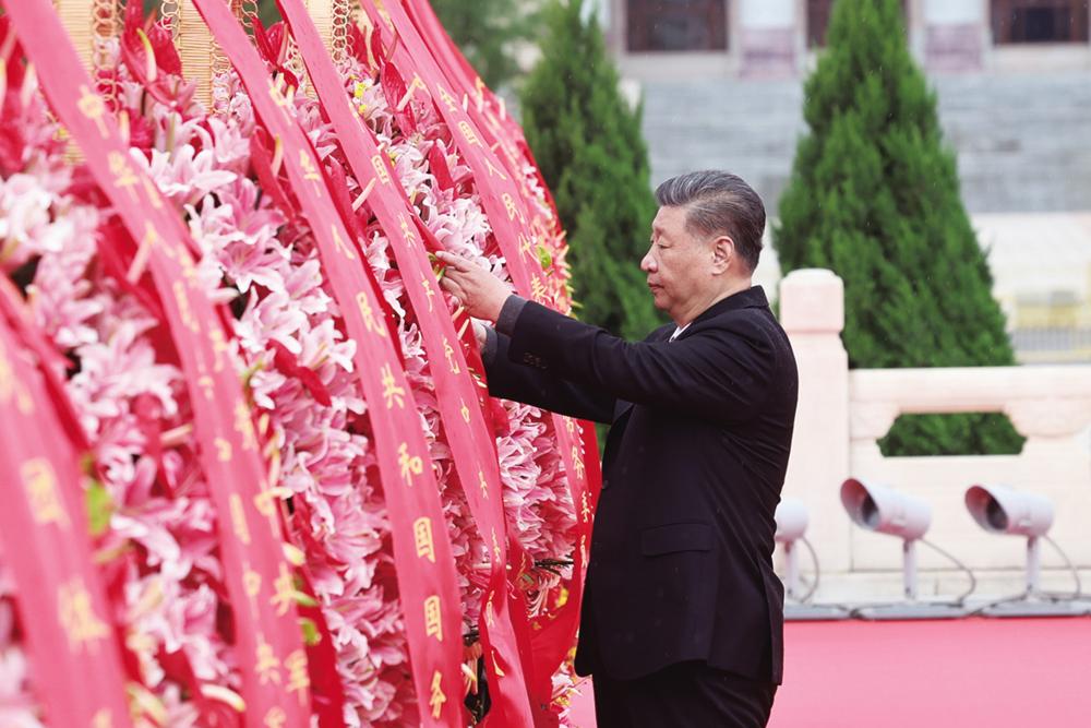 9月30日上午,党和国家领导人习近平、李强、赵乐际、王沪宁、蔡奇、丁薛祥、李希、韩正等来到北京天安门广场,出席烈士纪念日向人民英雄敬献花篮仪式。这是习近平整理花篮上的缎带。新华社记者 王晔 摄