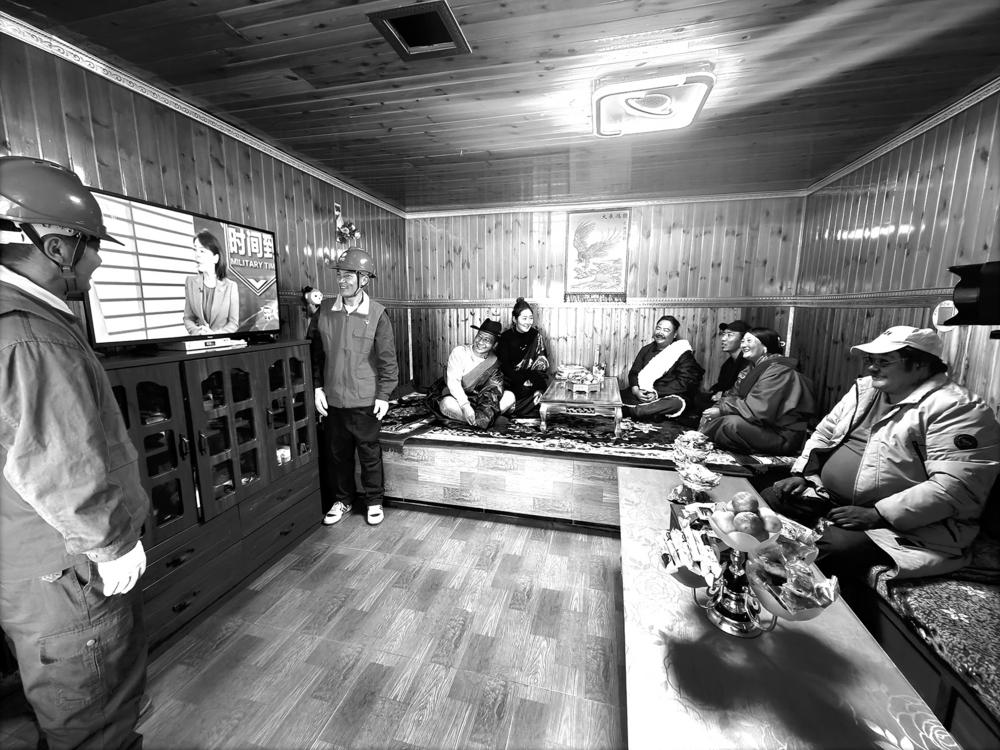 通电后,国网青海省电力公司供电服务人员与牧民群众共同观看电视,讲解安全用电知识。通讯员 许小萍 摄