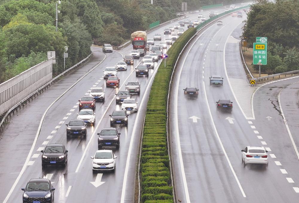 10月7日,车辆行驶在启扬高速扬州段(无人机照片)。 国庆假期最后一天,各地迎来返程高峰。新华社发(孟德龙 摄)