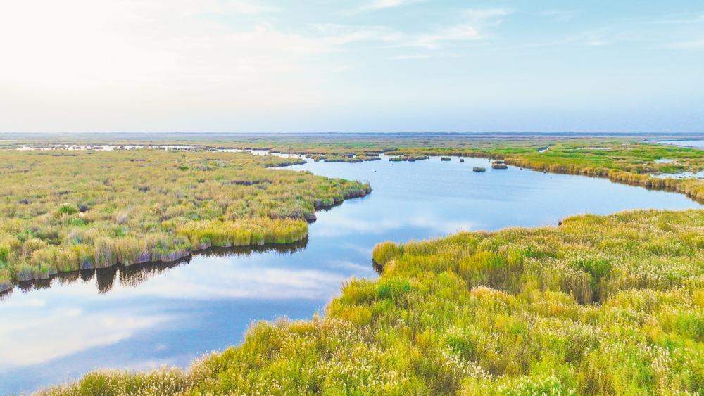 →这是在新疆巴音郭楞蒙古自治州博湖县拍摄的博斯腾湖芦苇湿地(10月6日摄,无人机照片)。 祖国大好河山壮丽辽阔、美不胜收。国庆期间,记者用航拍视角呈现各地美景。 新华社发(年磊 摄)