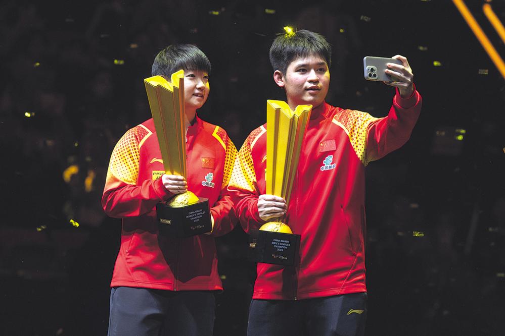 10月6日,男单冠军林诗栋(右)与女单冠军孙颖莎在颁奖仪式上自拍。 当日,在北京举行的2024年世界乒乓球职业大联盟(WTT)中国大满贯男子单打决赛中,中国选手林诗栋4比3战胜队友马龙,夺得冠军。新华社记者 肖艺九 摄
